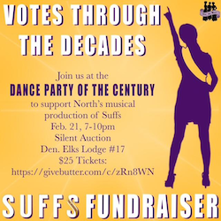 - Attend a community fundraiser for Suffs entitled "Votes Through the Decades." It will be held on Saturday February 21, from 7:00 to 10:00 p.m. at the Diamond Hill Elks Lodge. The lodge is located at 2475 West 26th Avenue, Denver, 80211. There will be a silent auction and tickets for the event cost $25. For tickets, see https://givebutter.com/c/zRn8WN.