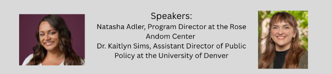 LWVD has asked several experts in the field of domestic violence to address these disturbing statistics, what might be done to reverse the trends, including the newly-introduced bill, and what is the state of resources for survivors of domestic violence locally. Our speakers are Natasha Adler, Program Director at the Rose Andom Center, and Dr. Kaitlyn Simms, Assistant Director of Public Policy at the University of Denver. The Rose Andom Center opened ten years ago as Colorado’s first family justice center in collaboration with community-based organizations and city government agencies to serve individuals and families impacted by domestic violence and sexual assault in accessing comprehensive services and safety from abuse. Dr. Simms studies policies and programs that serve survivors of domestic violence, creating a registry of domestic violence shelter programs in the US. We are also hoping to have a representative from the Denver District Attorney’s Family Violence Unit join our panel on March 17.
