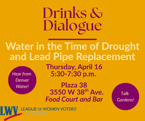 Denver Water will be present to answer your questions on what water restrictions to expect during the present drought and other strategies for conserving and managing water. This will include gardening ideas and a look at their Garden in a Box. Denver Water will also discuss the plans for the lead pipe replacement project throughout the city and give tips on how to prepare for when they come to your neighborhood.