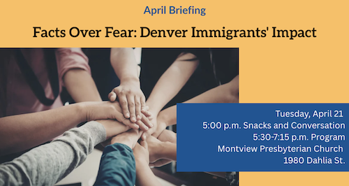 Our briefing on Tuesday, April 21 will offer a panel of speakers who will highlight the contributions of our immigrant neighbors provide which strengthen our communities and institutions. Among other speakers, we will hear from the Colorado Fiscal Institute and the Spring Institute. Please join us for this final briefing of the year and invite friends.
